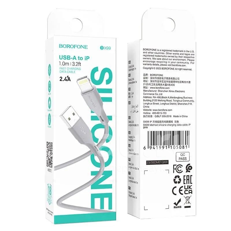 250руб.Кабель BOROFONE Lighting BX-99 2.4А 1m Silicone GR