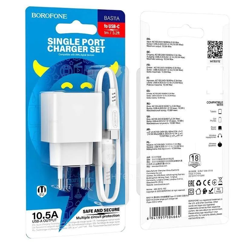 СЗУ BOROFONE BAS11A 1USB-A +Type-C 10.5W White