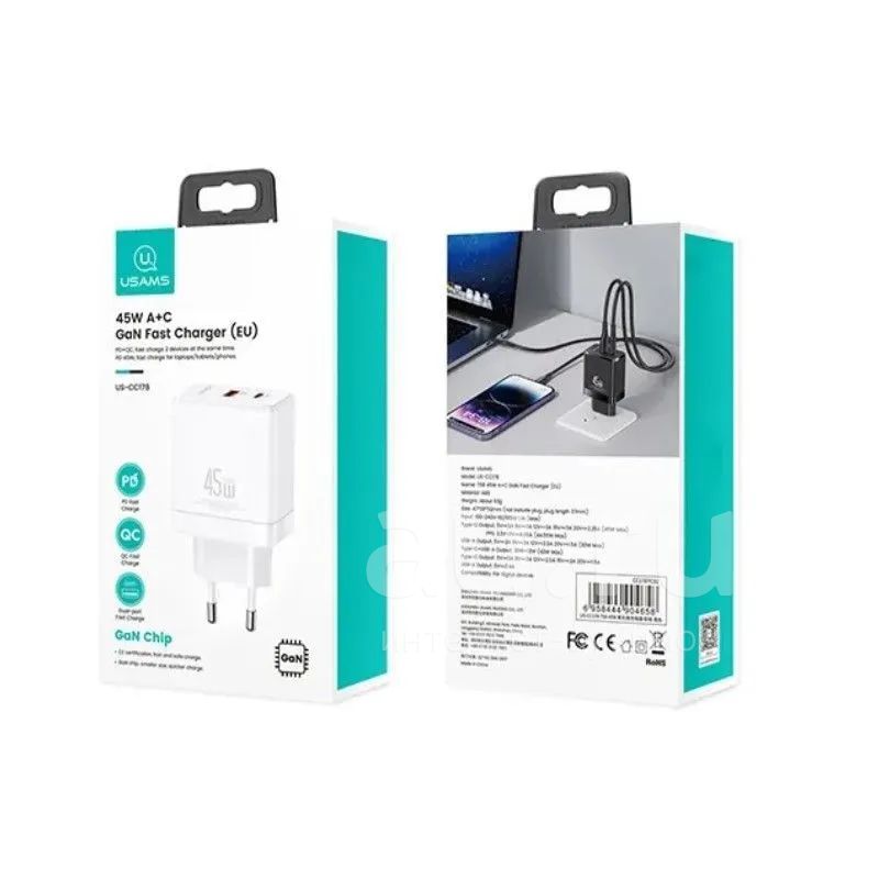 СЗУ USAMS CD-CC178 USB-A+USB-C PD 2PORTS 45W GaN FAST CHARGE White