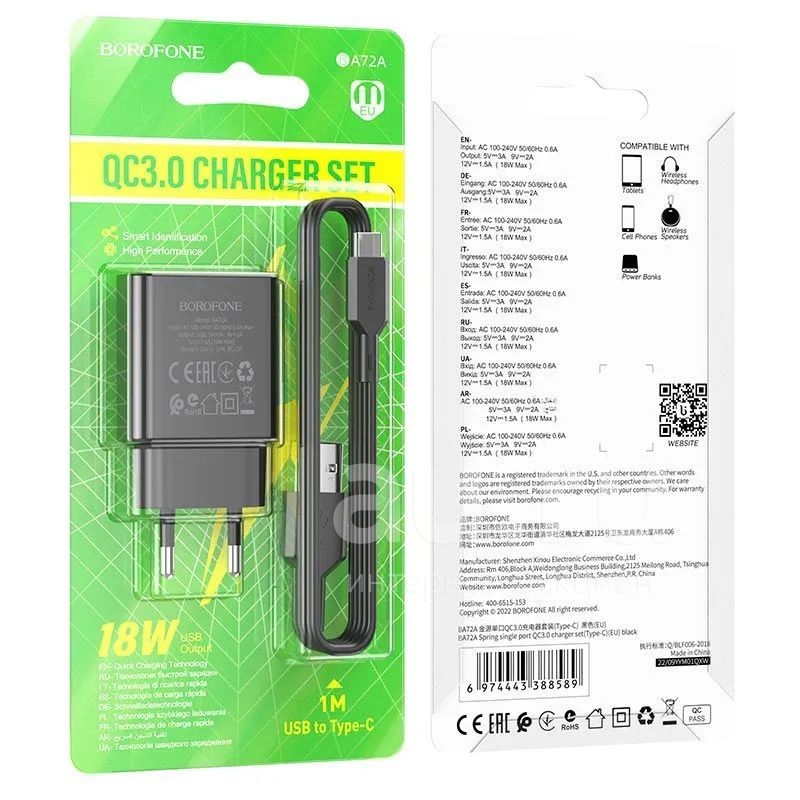 СЗУ BOROFONE BA-72A 1*USB-A TYPE-C QC3.0 18W Black