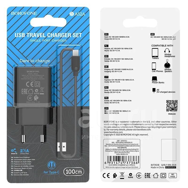 250руб.СЗУ BOROFONE BA-52A 1*USB+Type-C White