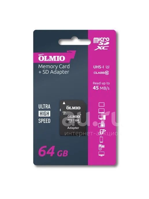 250руб.КАРТА ПАМЯТИ OLMIO microSDHC 64GB UHS-I U3 V3 +ад