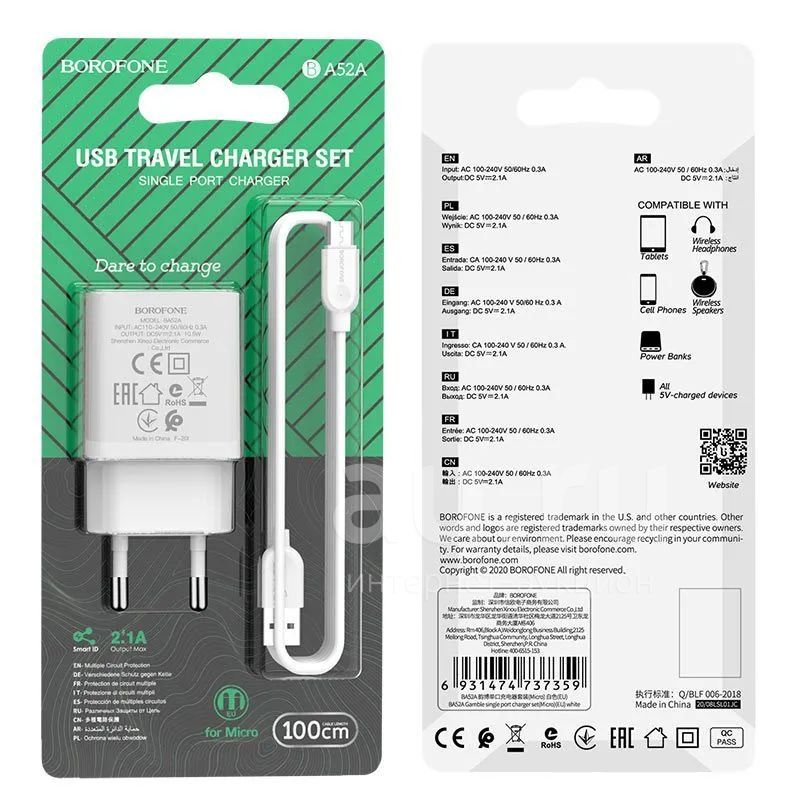 СЗУ BOROFONE BA-52A 1*USB+microUSB 2.1A White