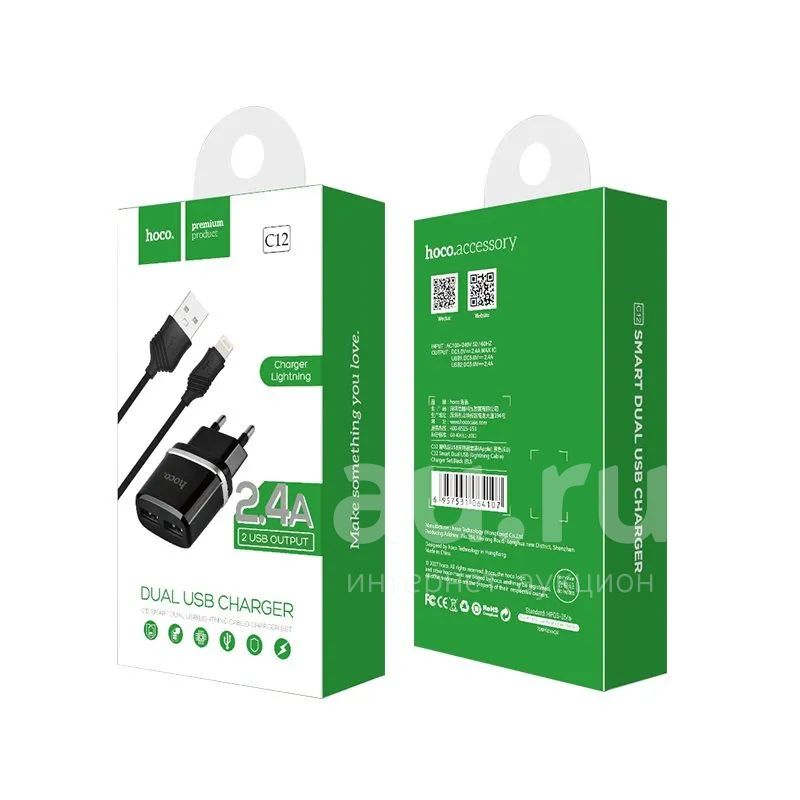 СЗУ HOCO C12 dual USB port 2.4A + Lighting (Black)