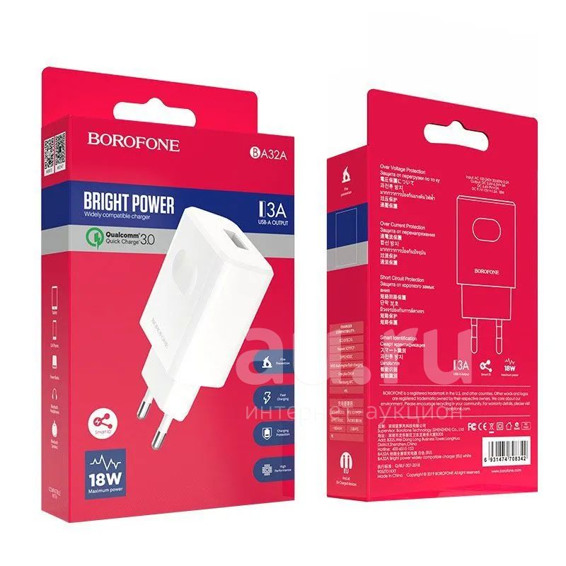 350руб.СЗУ BOROFONE BA-32A 1*USB QC3.0 White