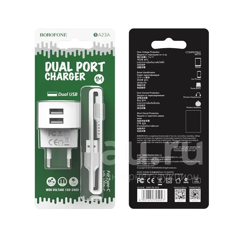 350руб.СЗУ BOROFONE BA-23A 2*USB+Type-C 2.1A White