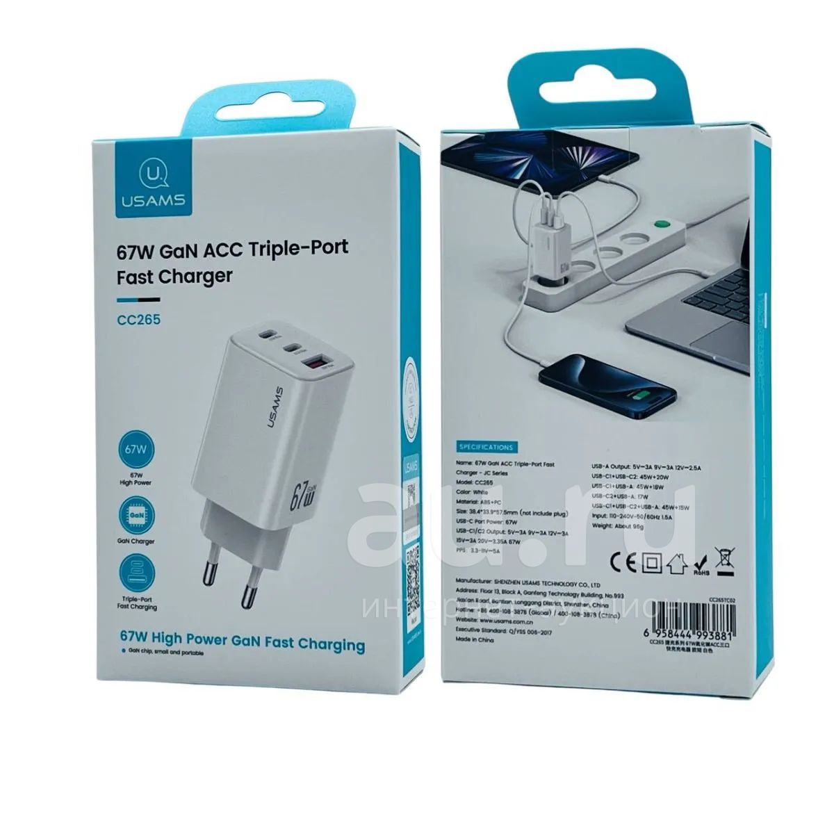 250руб.СЗУ USAMS US-CC265 1A+2C PD 67W GaN FAST CHARGE White