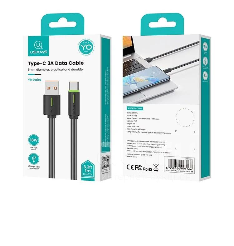 250руб.Кабель USAMS Type-C YR SJ732 18W 1m Black