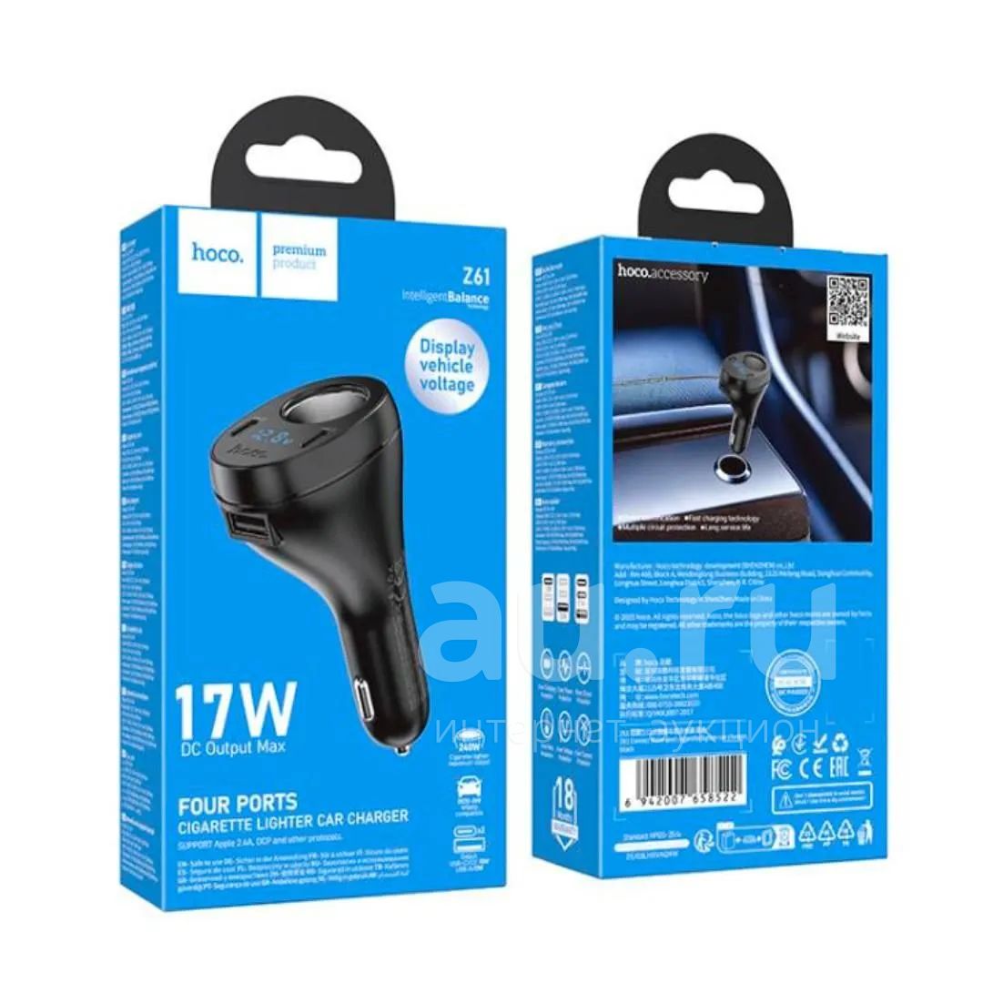 250руб.АЗУ HOCO Z61 Correct three-port cigarette lighter car charger 17W Bl...