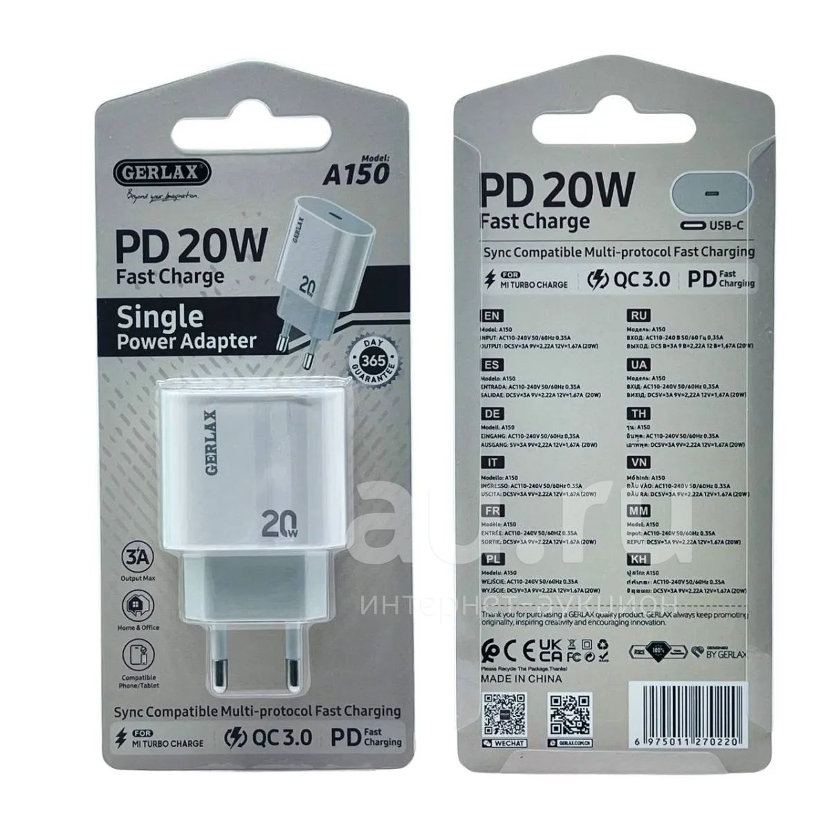 250руб.СЗУ GERLAX A150 1C QC3.0 PD20W White