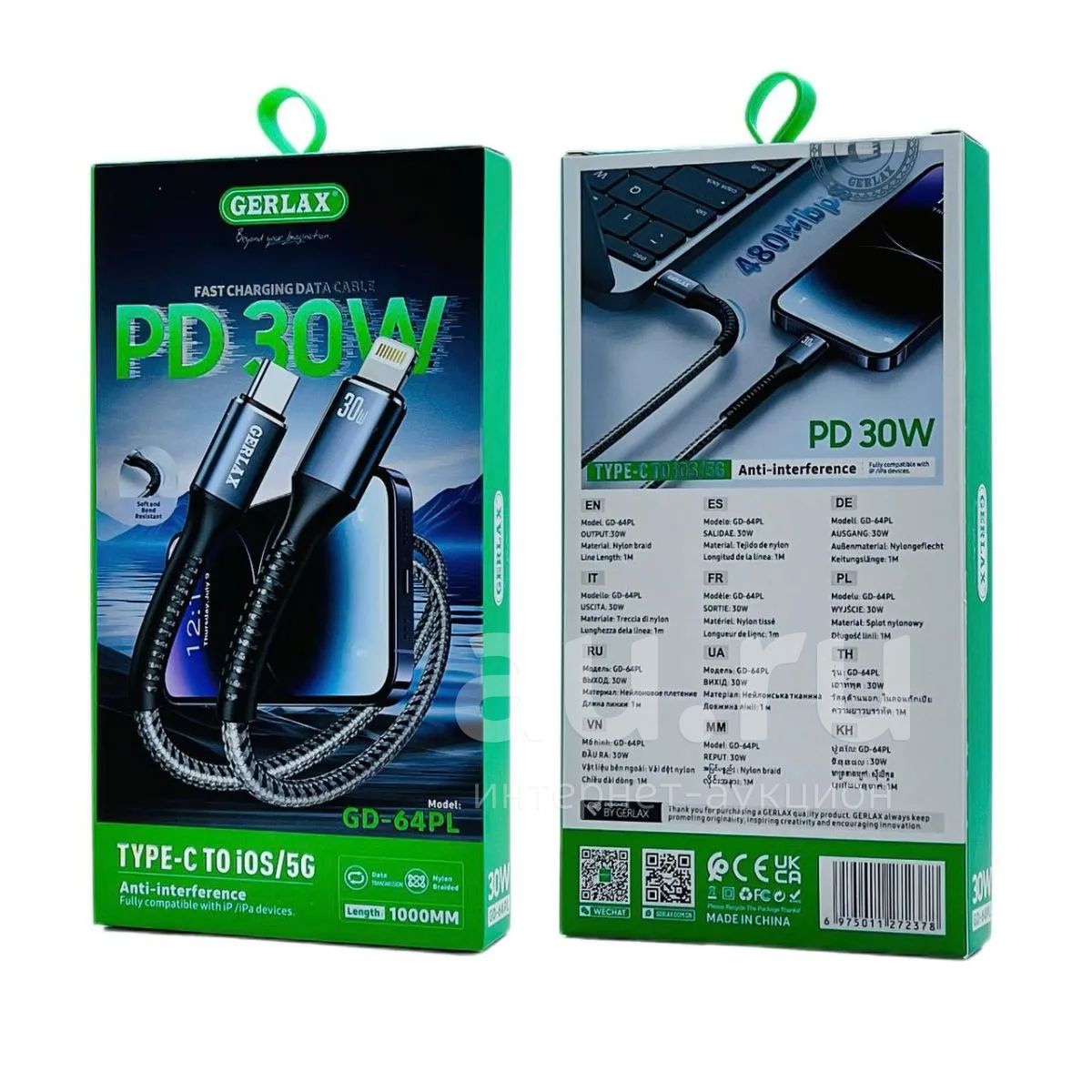 250руб.Кабель GERLAX GD-64PL TYPE-C-LIGHTNING 30W 1m Black