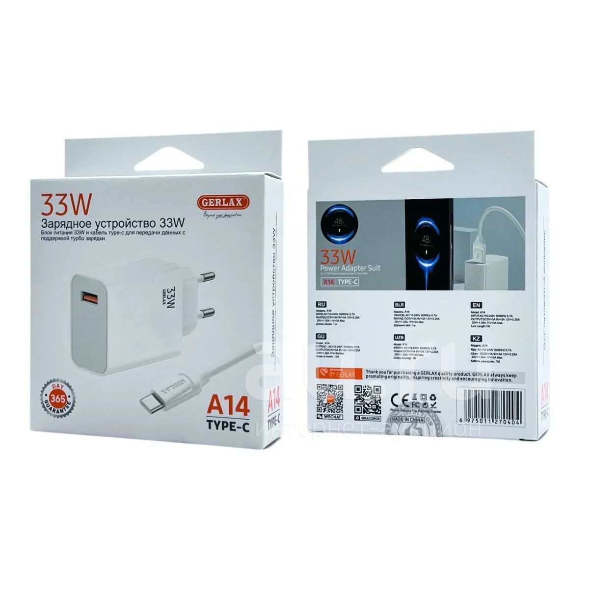 100руб.СЗУ ДЛЯ GERLAX A14 WHITE SINGLE USB-A+TYPE-C 33W WH