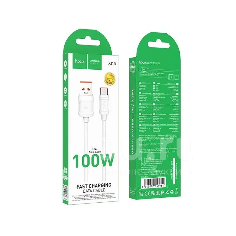 250руб.Кабель HOCO X115 TYPE-C 100W 1m (White)