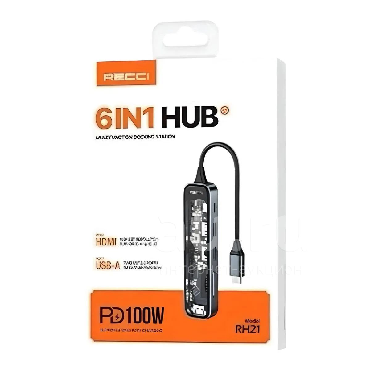 100руб.HUB адаптер 6в1 RECCI RH21 USB-C TRANSPARENT GREY