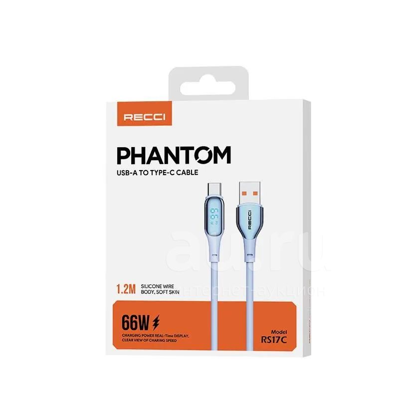 100руб.Кабель RECCI PHANTOM TYPE-C RS17C LED 66W 1.2m Blue