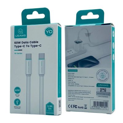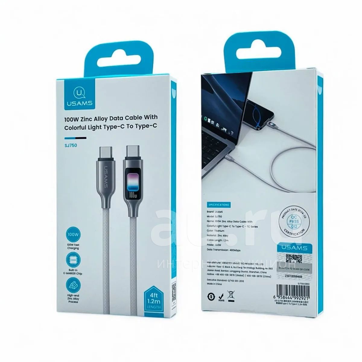 250руб.Кабель USAMS Type-C-->Type-C SJ750 PD 1.2m 100W RGB LED Titanium