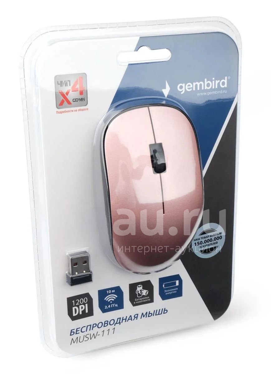 500руб.МЫШЬ БЕСПРОВОДНАЯ GEMBIRD MUSW-111-RG, 3кн, 1200 DPI, розовый, блистер