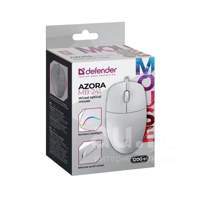 365руб.МЫШЬ ПРОВОДНАЯ DEFENDER Azora MB-241 белый,3D,1200dpi,1,8м
