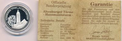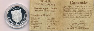 Германия 1994 Медаль жетон Альтенбург Замок - резиденция Серебро Ag 999 D-30мм Коробка сертификат